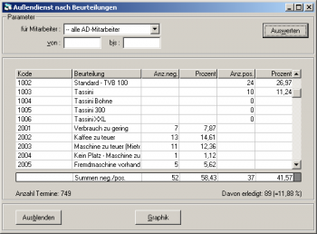 In der Tabelle werden alle für die Besuchsberichte definierten Beurteilungen alphabetisch sortiert aufgelistet. Für jede Beurteilung werden Name und Beschreibung ausgegeben, die Anzahl der damit gekennzeichneten Besuche sowie entsprechende Prozentwerte.