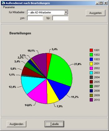 In dieser Maske werden die bei der Erfassung der Besuchsberichte gegebenen Beurteilungen ausgewertet und tabellarisch und graphisch dargestellt. Haben Sie z.B. in den Beurteilungen Ihre Produktgruppen „versteckt“, zeigt Ihnen diese Tabelle, wie Ihre Produktgruppen in den einzelnen Branchen abgesetzt werden.