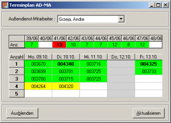 In der oberen (einzeiligen) Tabelle werden die für die kommenden Wochen vereinbarten Außendienst-Termine angezeigt. Ist für eine Woche die Anzahl größer als vorgesehen, wird das entsprechende Feld rot hinterlegt, ansonsten grün. Wochen ohne Termine erhalten eine weiße Hintergrundfarbe.