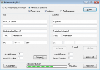 Wichtig bei der Ähnlichkeitsprüfung ist die Auswahl der Felder, die dazu herangezogen werden sollen (siehe oben). Wird nur der Firmenname verwendet, werden verschiedene Niederlassungen einer Firma als Dubletten gewertet, da ja die eigentliche Adresse nicht berücksichtigt wird. Wird die Adresse in die Prüfung mit einbezogen, können unterschiedliche Niederlassungen einer Firma auch als eigene Firmen gespeichert werden.