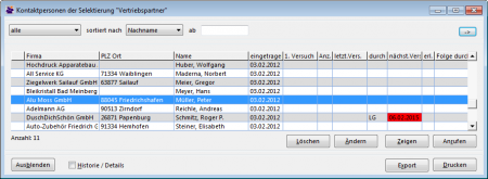erl. durch | Initialen des Benutzers, der den letzten Kontakt-Versuch durchführte, der den Partner erreichte und einen Eintrag in der Kontakt-Historie erstellte oder der in der Maske „Anrufen nach Selektierung“ die Schaltfläche „erledigt“ betätigt hat |