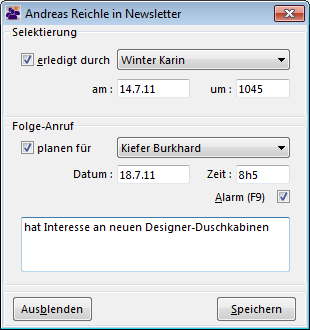 Wenn Sie das Erledigt-Kennzeichen für eine Kontaktperson in der Selektierung zurücksetzen, wird ein eventuell früher geplanter Folge-Anruf nicht gelöscht.