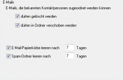 Im Sinne einer durchgängigen Dokumentation der Kommunikation mit allen Kontaktpersonen sollten eingegangene E-Mails, die einer in der Datenbank gespeicherten Kontaktperson zugeordnet werden können, immer in der entsprechenden Kontakthistorie gespeichert werden. Mit diesen beiden Optionen kann jedoch erlaubt werden, dass solche E-Mails gelöscht oder in einen lokalen E-Mail-Ordner verschoben werden.