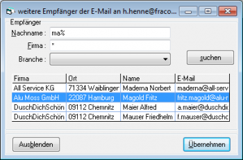 Über diese Schaltfläche öffnen Sie die Maske zur Auswahl weiterer Empfänger der E-Mail. Nach Eingabe der ersten Buchstaben des Nachnamens wird bereits die Tabelle gefüllt und mit jedem weiteren Buchstaben verfeinert.