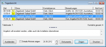 Der Tagesbericht umfasst alle Kontakte für ein bestimmtes (einstellbares) Datum, also alle in der Kontakt-Historie eingetragenen Notizen zu Telefonaten, E-Mails, Briefe usw. Nach dem Aufruf der Funktion werden die Daten für das aktuelle Datum angezeigt.