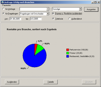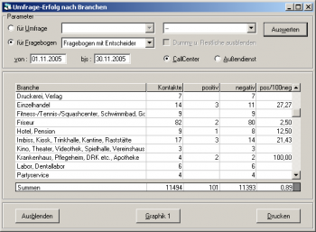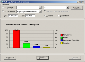 In der letzten Spalte wird das Verhältnis der positiven zu den negativen Beurteilungen angegeben, also die Auftragswahrscheinlichkeit für jede der Branchen. Dabei kann ein Faktor (z.B. positive pro 100 negativen) verwendet werden, der in der Konfiguration für Umfragen definiert werden kann.
