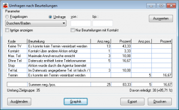 In der Tabelle werden alle beim Fragebogen definierten Beurteilungen alphabetisch aufgelistet. Für jede Beurteilung werden Name und Beschreibung ausgegeben, die Anzahl der damit abgeschlossenen Kontakte sowie entsprechende Prozentwerte.
