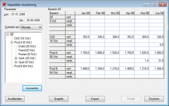 In dieser Maske können Sie die in der Abteilungs-Struktur definierten Kapazitäten von Mitarbeitern, Maschinen usw. den verplanten und verbrauchten Kapazitäten aus der Projekt-Verwaltung und der Fertigung gegenüberstellen.