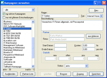 Mit dieser Maske verwalten Sie Ihre Kampagnen. Außerdem können Sie eine Tabelle aller über eine Kampagne gewonnenen Interessenten erstellen.
