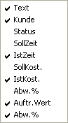 Es erscheint ein Popup-Menü, in dem die Spalten, die ein- bzw. ausgeblendet werden können, aufgelistet sind. Ein Häkchen vor einer Spalte gibt an, dass die Spalte dargestellt werden soll. Durch einen Mausklick auf die entsprechende Zeile in dem Popup-Menü können sie die Spalte ein- oder ausblenden.