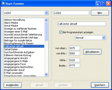 Seit der Version 1.0 kann jeder Benutzer bestimmen, welche Funktionen (=Masken) beim Start von wo und in welcher Größe geöffnet werden sollen (siehe Maske Start-Fenster). Dies wird nun erweitert durch die Möglichkeit, verschiedene Varianten - als Desktop bezeichnet - definieren zu können. Damit ist es z.B. möglich, einen Desktop mit den Masken für Kunden-Akquise zu erstellen, einen für die Planung von Außendienst-Aktivitäten usw.